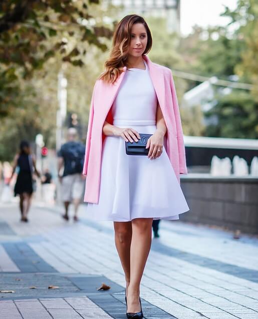 Yes, it’s totally possible to wear white in winter, and it gives an ultra chic look! Add a pop of color to the little white dress with a vibrant jacket (and keep warm at the same time!).