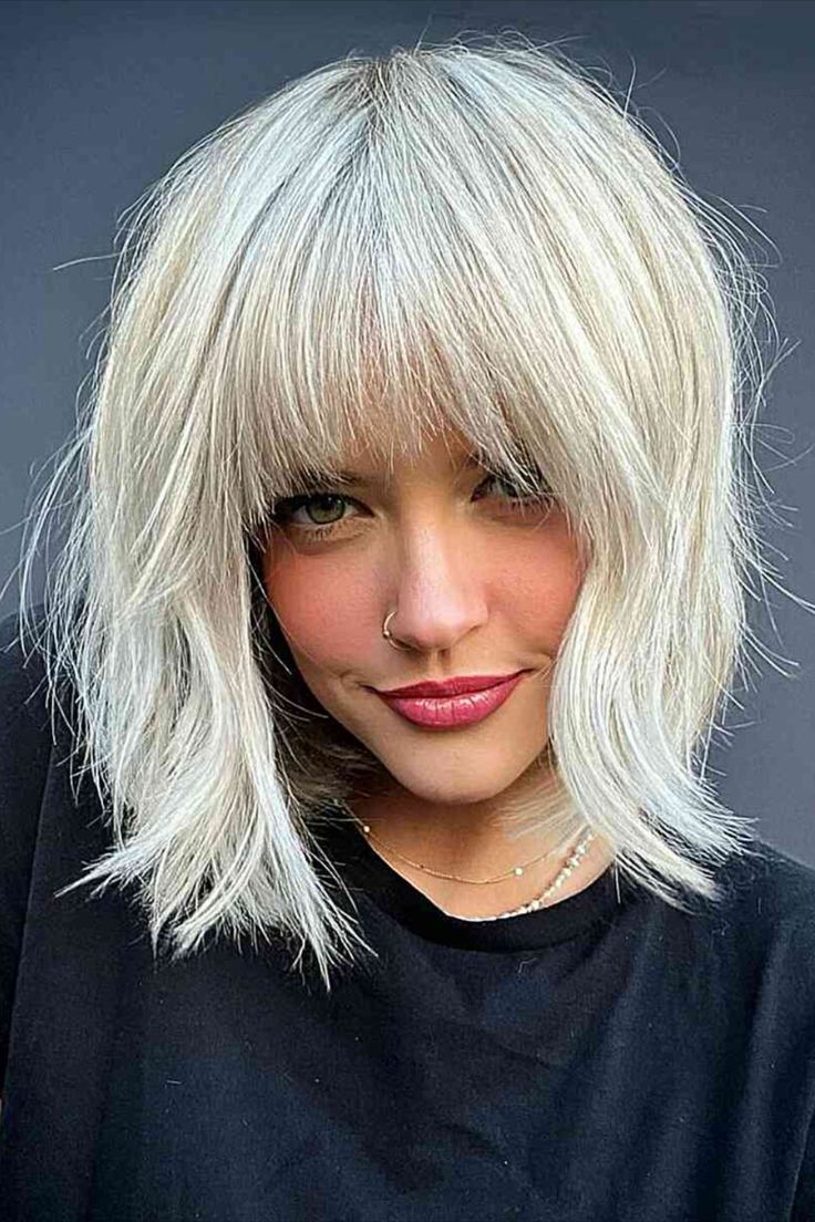 Choppy layers and bangs bring personality to the classic lob. Silver tones give it a cool, contemporary twist.