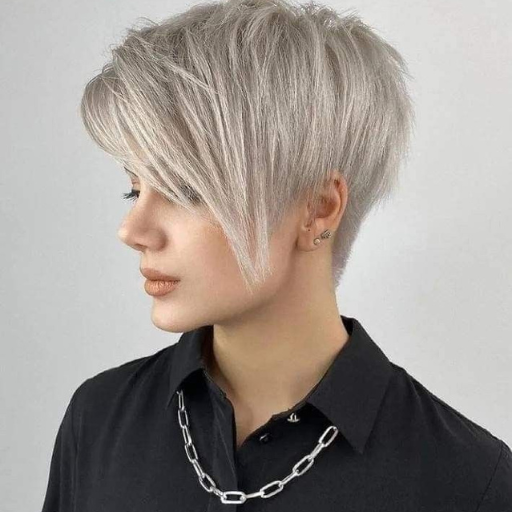 This short, spiky look is youthful and rebellious. The silver color gives it an unexpected touch of sophistication.