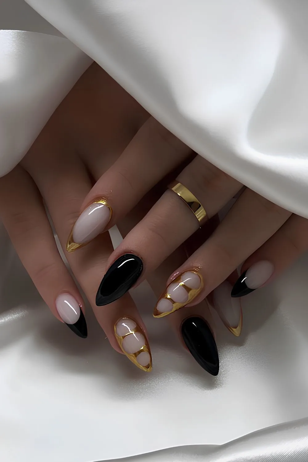 A dramatic mix of black polish with gold foil creates a stunning, high-contrast manicure. Perfect for evening wear or a statement moment, these nails are unapologetically bold. The almond shape adds a sleek finish to the rich color combo. It’s edgy glam done right.