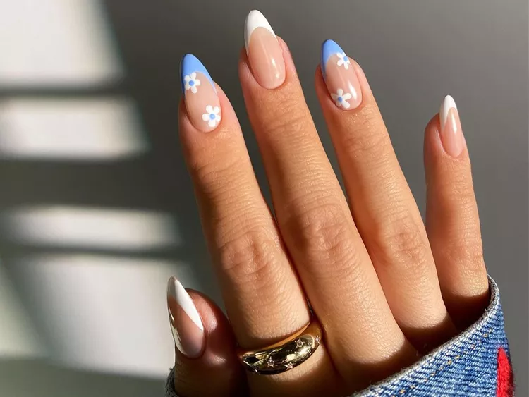 Tiny hand-painted or sticker florals add a feminine charm to any base color. Whether placed on a nude or pastel background, flowers pop beautifully on almond tips. It’s a soft, romantic look that feels fresh in any season. Try it for spring or garden-party vibes.