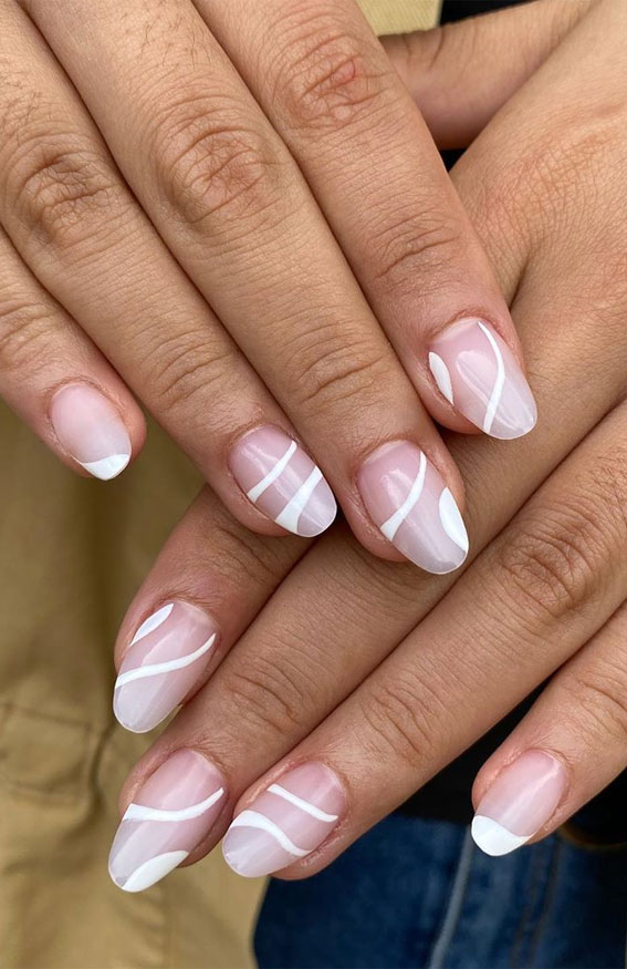 Thin white line art on a sheer base creates a modern, minimalist look. The geometric or curved line patterns keep things simple yet eye-catching. On almond acrylics, the design feels fresh and architectural. Great for lovers of subtle nail art.