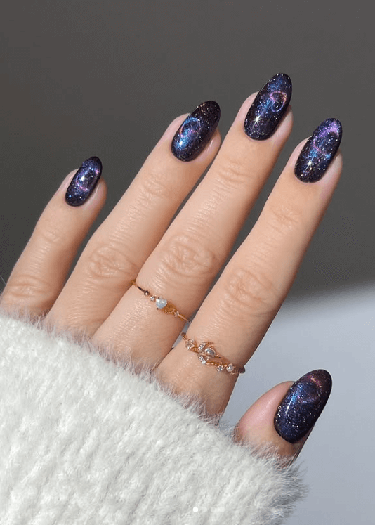 Swirls of deep purples, blues, and fine glitter bring a cosmic flair to your manicure. These nails look like mini galaxies—mysterious, sparkly, and bold. The almond shape helps keep the look classy instead of costume-y. Ideal for stargazers and dreamers.