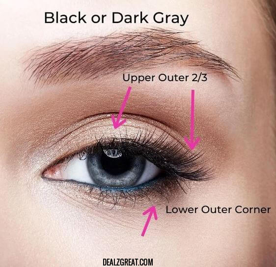 Apply a black or dark grey eyeshadow down the lash line to the upper, outer 2/3 of the lash line and the lower, outside corner of the eye.