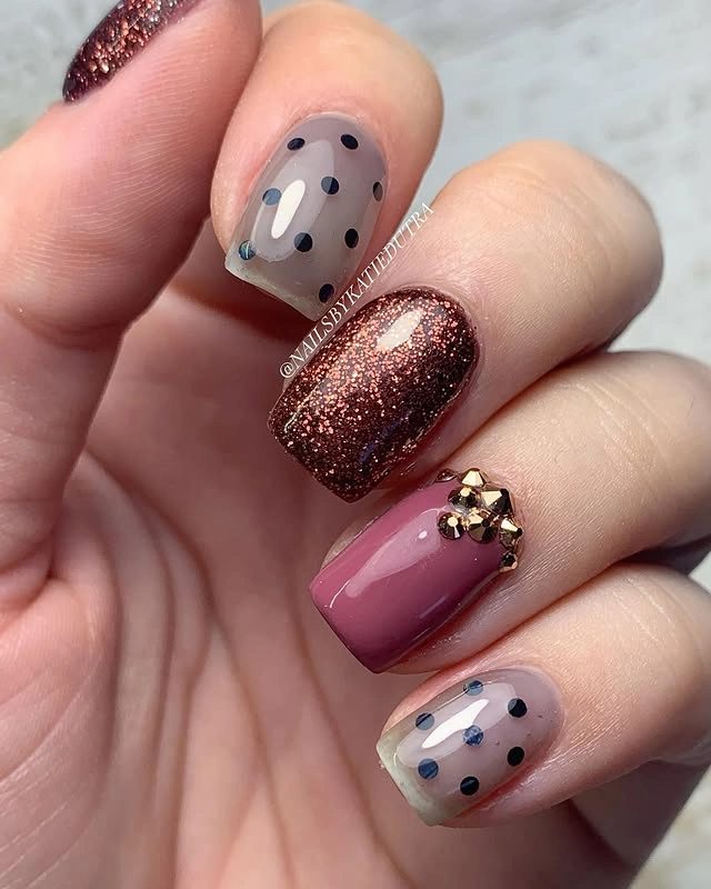 Add a touch of glamour by featuring glittery polka dots on one or two accent nails while keeping the rest simple. This look strikes the perfect balance between classic and festive, making it ideal for parties or special occasions. It’s easy to customize with your favorite glitter.