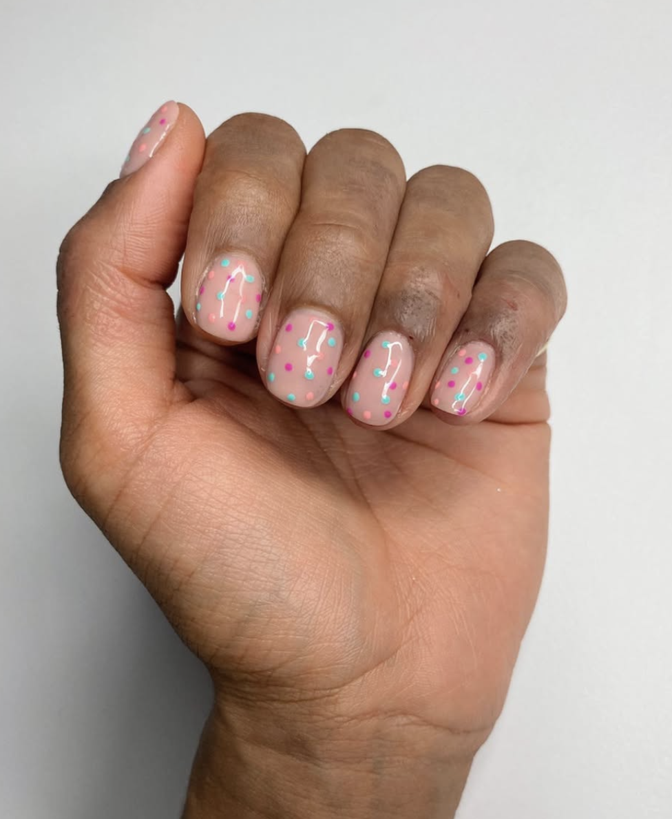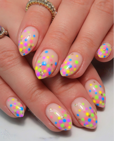 A cheerful and versatile appearance is created by scattering bright, multicolored dots over a neutral, nude background. It’s elegant enough for daily wear yet still enjoyable enough for casual wear. Without being overpowering, this design adds a nice pop of color.
