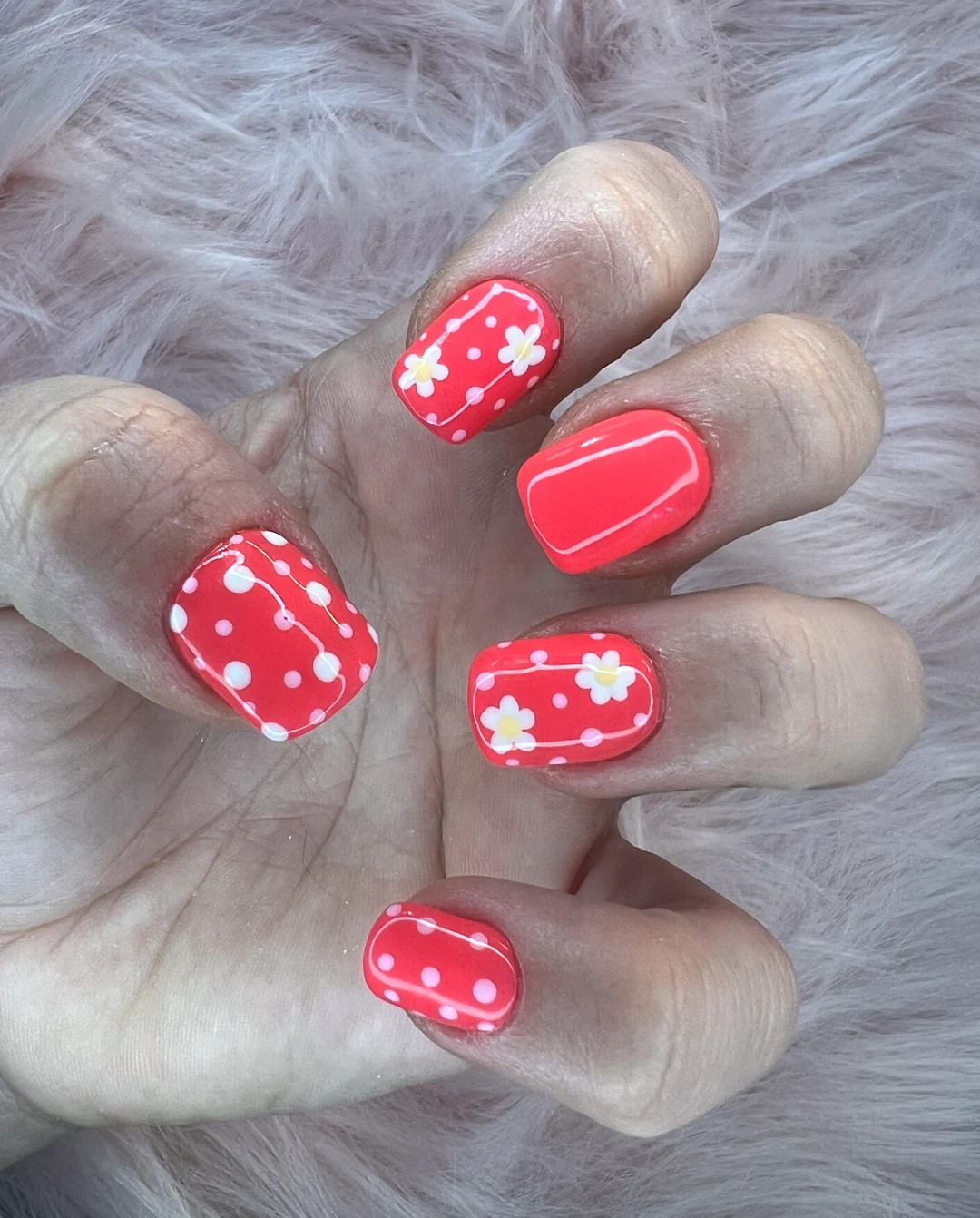 Classic red nails with white polka dots inspire old ’50s charm and retro appeal. This eye-catching style is ideal for folks who enjoy a bold statement and a retro feel. Match it with lipstick for a stunning vintage look.
