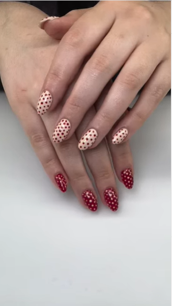 Glossy polka dots on a matte base create a striking textural contrast that feels modern and stylish. This unexpected finish adds sophistication while keeping the playful spirit of polka dots alive. Perfect for those who want a chic yet subtle nail art.