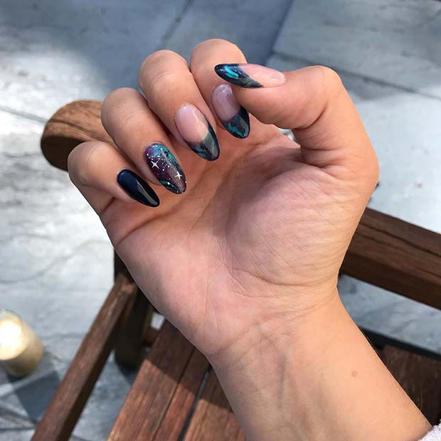 Almond-shaped nails offer the perfect canvas for intricate designs, and galaxy tips are no exception. Keep the base color soft and neutral, then add cosmic swirls and stars to the tips. This design adds a sophisticated touch to the galaxy trend, making it ideal for both everyday wear and special occasions.