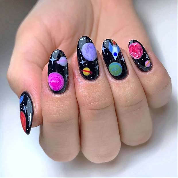 This design is perfect for anyone who loves the idea of little planets floating across their nails. Use soft pastels or bright colors to paint mini planets, stars, and moons on a dark or neutral background. It’s playful and adorable, making it a fun choice for casual days or when you’re feeling extra whimsical.