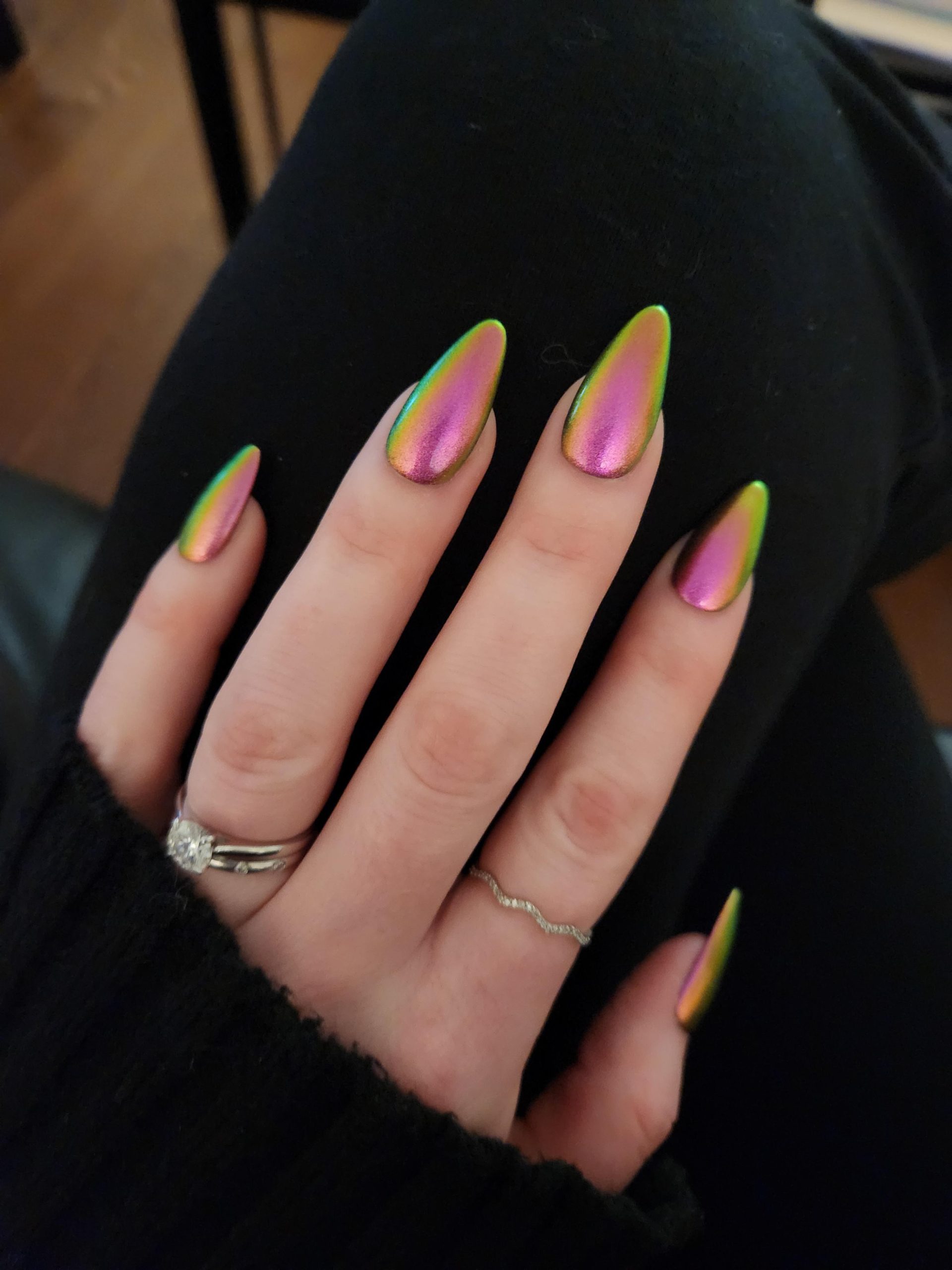 Iridescent rainbow chrome emits a futuristic radiance that varies with light. It is bold, rich, and ideal for making a statement.