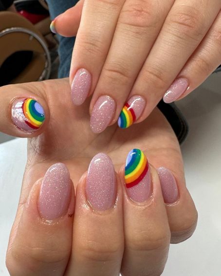 This shimmering rainbow nail art design adds appeal and glamor to the manicure and is unique. The nails are initially coated with a glittering peach manicure polish, after which rainbows are painted on the thumb and ring fingers with various bright hues. The rainbow on the fingertips seems extremely lovely.