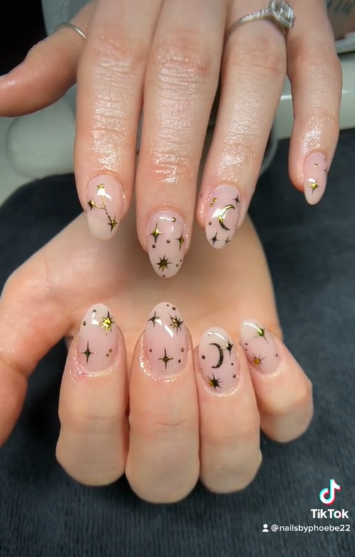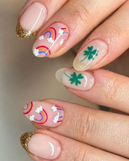 The charming small rainbows on each nail make this nail art appear really appealing. The nails are embellished with various designs, including these small rainbows. The gold points on the ring and tiny fingers enhance this rainbow nail art design.