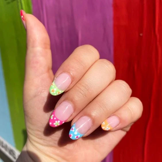 Rainbow flower tips add a lovely complement to your nails. To get this look, start with a sheer base coat. Next, use a fine nail brush to paint colorful flower petals on the tips of your nails. A clear top coat will give you a polished appearance.