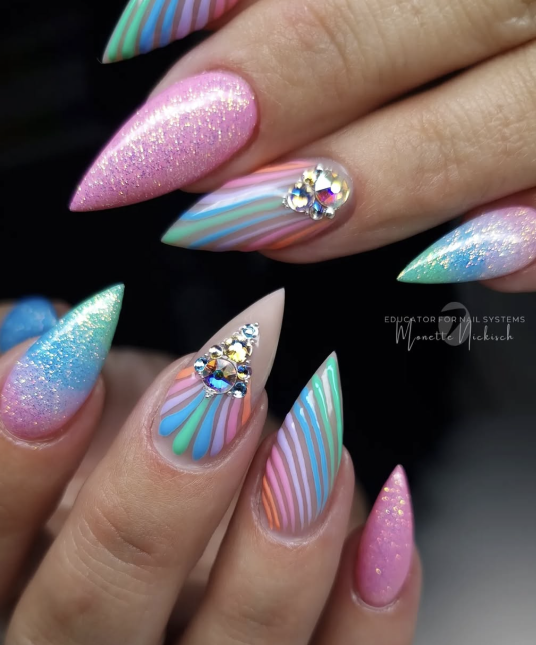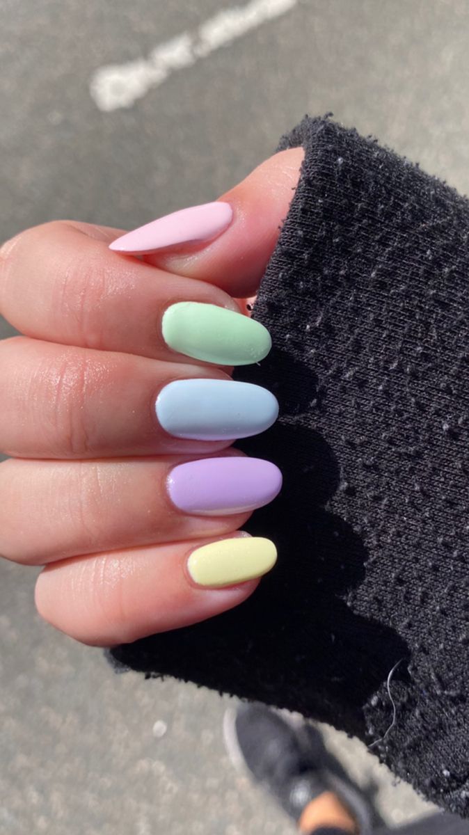 Soft pastels like mint, peach, and lilac arranged in rainbow order make this look super feminine. It’s ideal for Easter, baby showers, or soft glam styles.