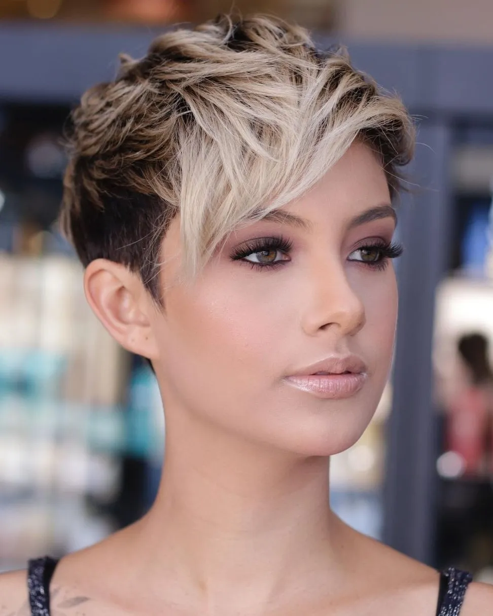 Show off dark roots paired with lighter ends for a dimensional, grown-out effect that’s super trendy in 2025. This coloring technique makes regrowth look intentional and chic. Pair it with a layered or side-swept pixie to maximize depth and interest.