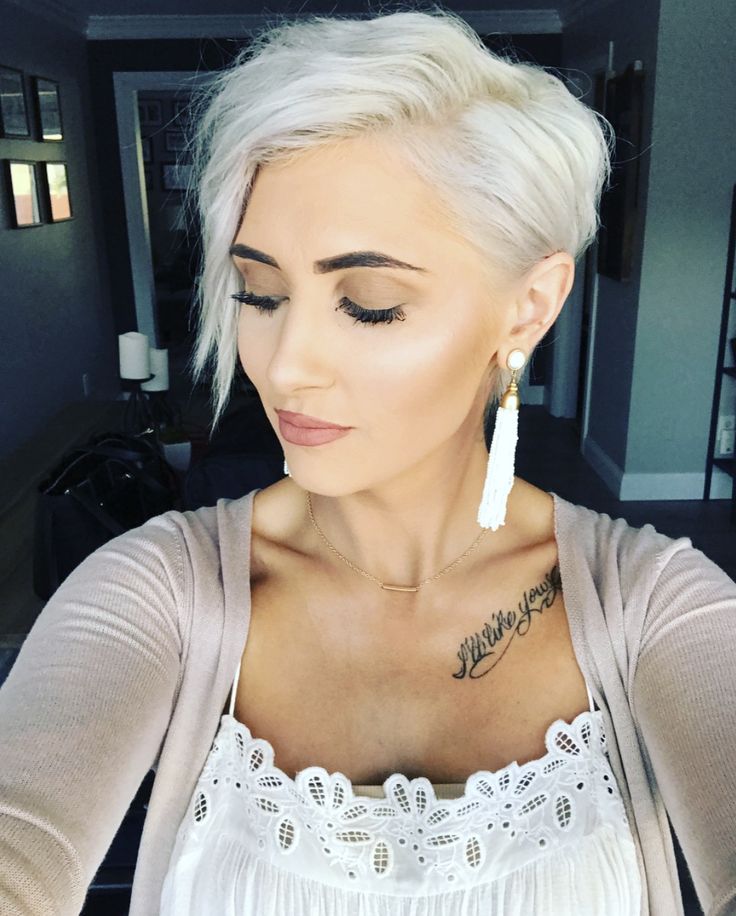 A platinum blonde pixie is bold, bright, and impossible to ignore. The icy tone pairs beautifully with short hair, highlighting the sharpness of the cut and enhancing features. If you’re ready to turn heads and embrace a high-fashion vibe, this look delivers.