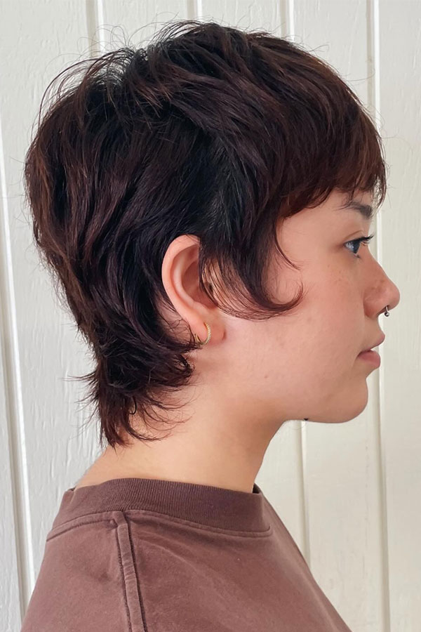 Inspired by shag hairstyles, this pixie features choppy layers for a disheveled, laid-back look. The irregular pieces provide plenty of movement and may be treated with mousse or texturizing spray for a carefree, messy-chic look. It’s the ideal option for those who prefer low-maintenance trends.