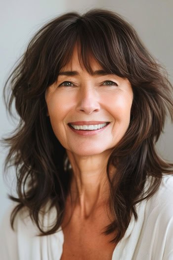 Full of movement and texture, the medium shag with bangs actually hides thinning hair beautifully.