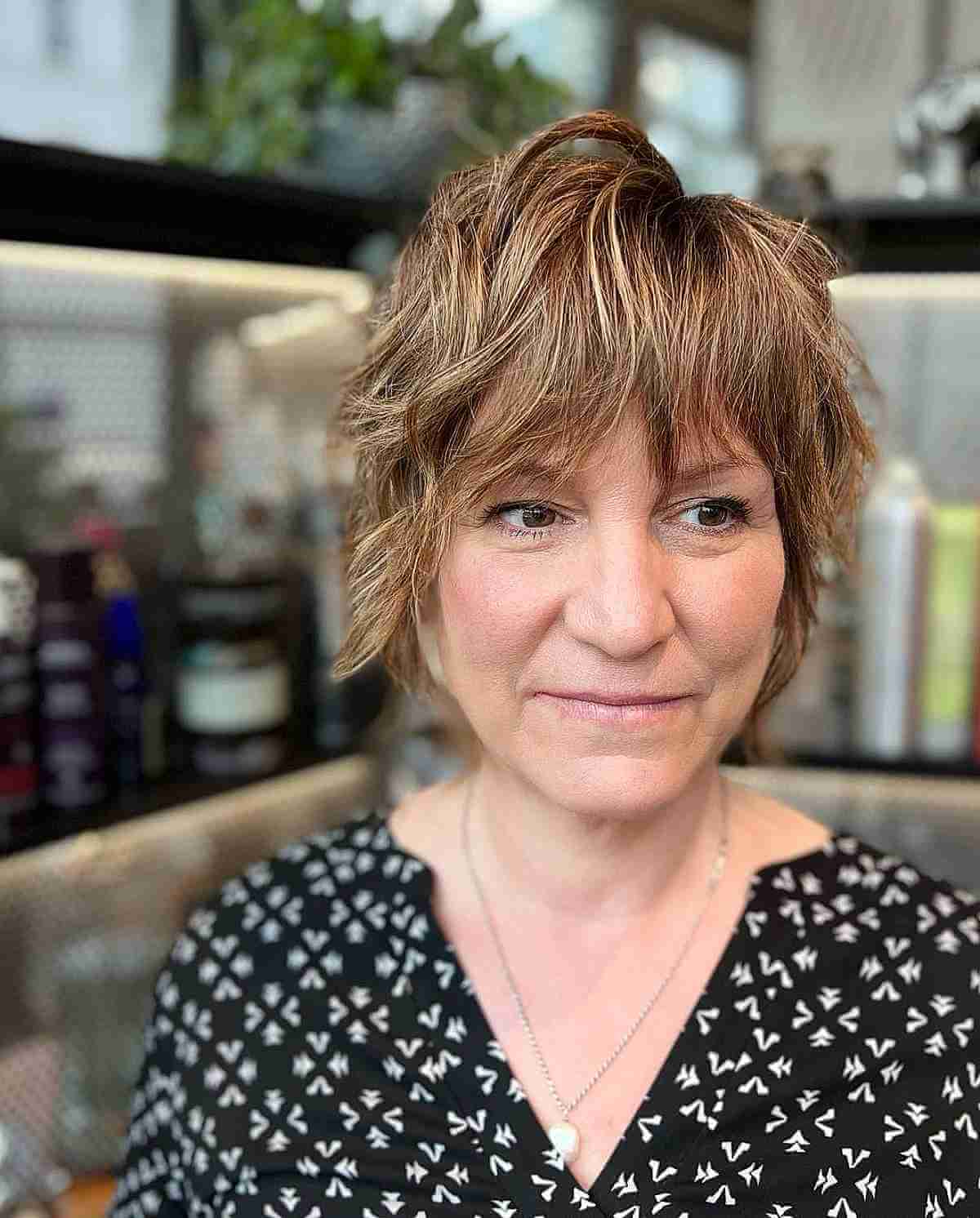 The choppy layers throughout create volume and disguise any sparse areas. The bangs add a youthful touch.