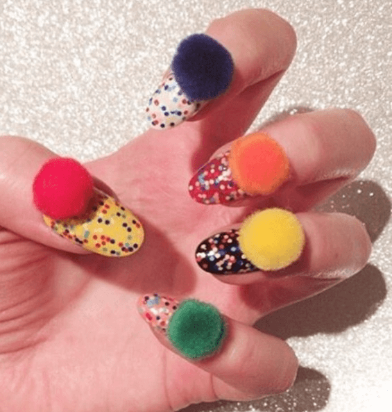 Pom pom nails appear to be the ideal choice for a quirky and feminine style. They’re bright, colorful, and fluffy; they’re not really practical, but that’s not what we’re looking for, is it?