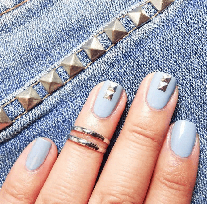 Two studs were layered in the center of both the middle and ring fingers, producing accent nails that are simple to replicate at home, even if your nails are short. If you truly want the studs to shine out, finish your look with a matte top coat.